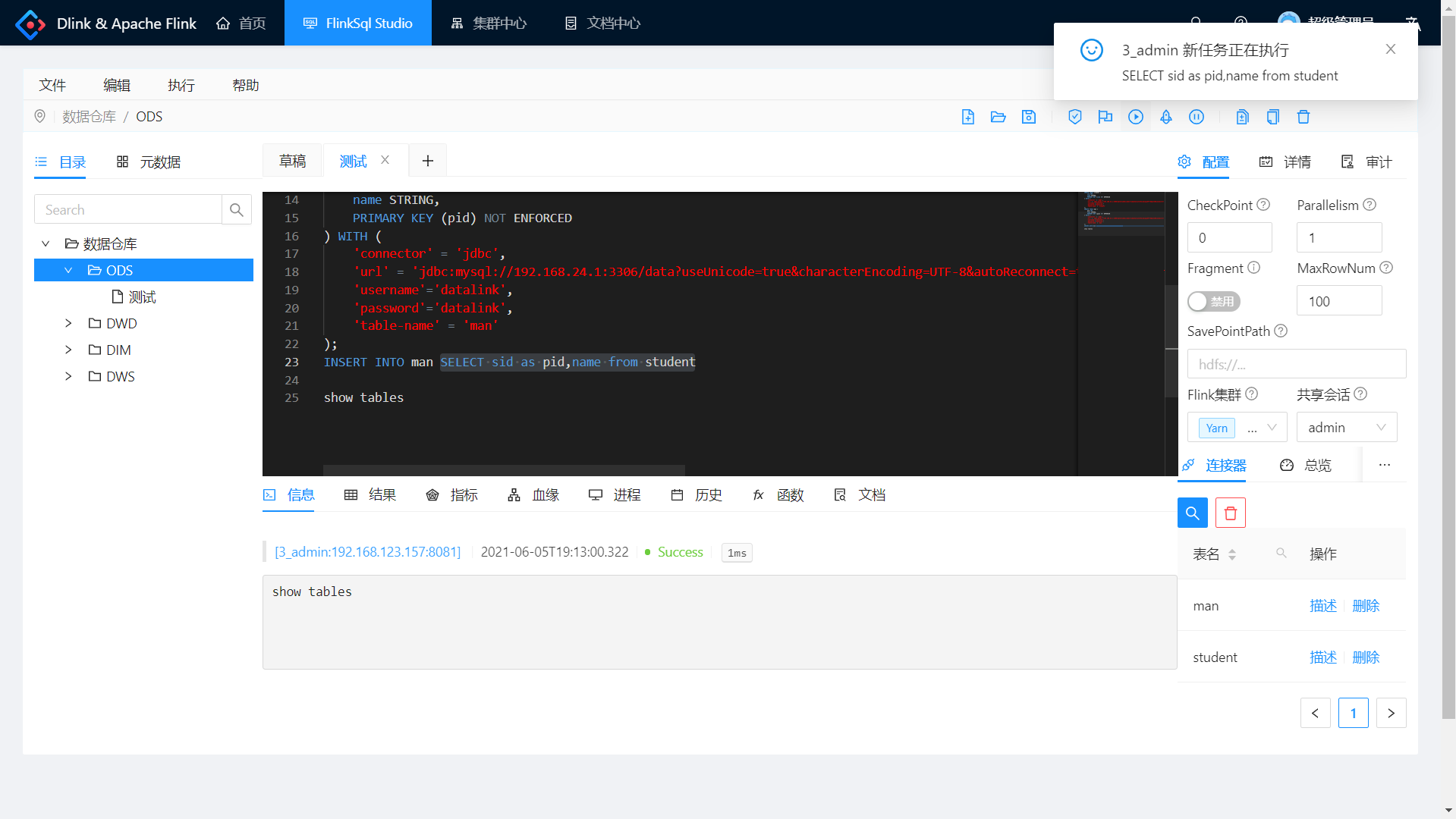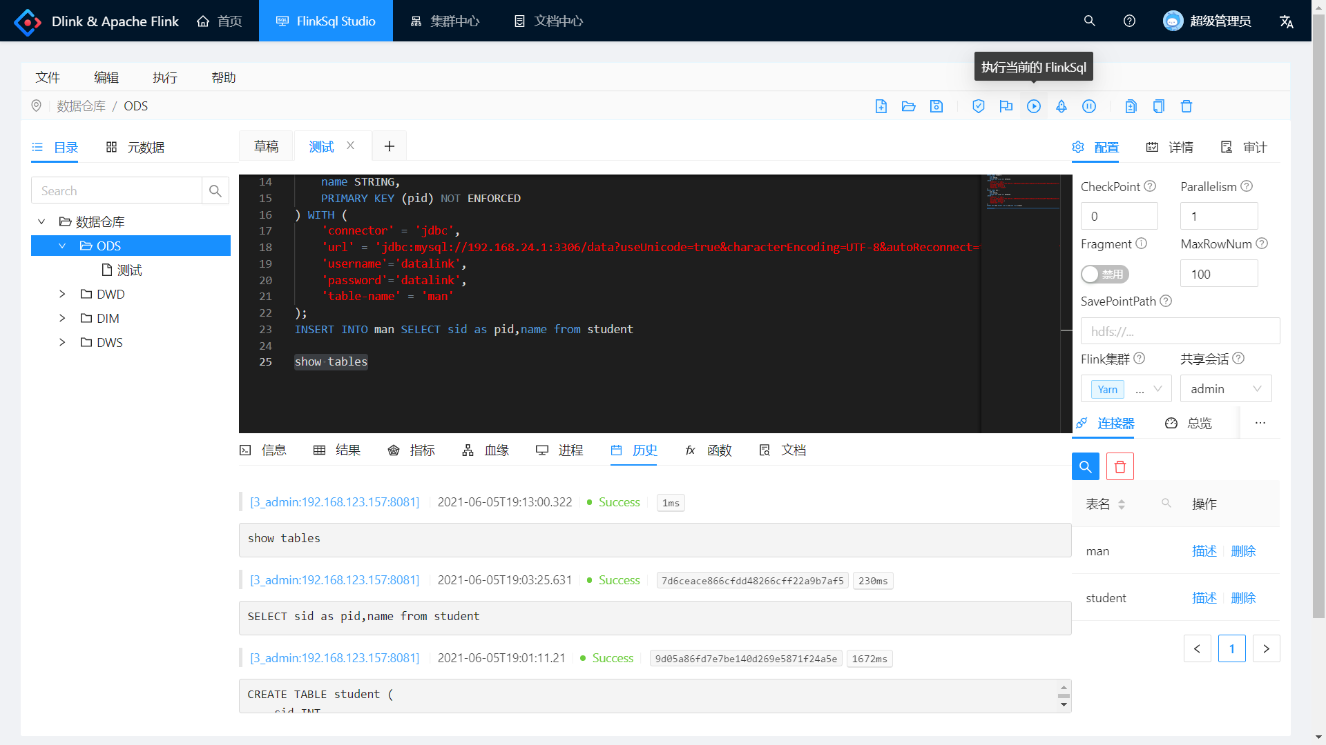 Dlink 为 Apache Flink 而生。它是一个 FlinkSQL Studio,可以在线开发、预览、调试 FlinkSQL,支持 Flink 官方所有语法及其增强语法,并且可以远程提交 Sql 作业到集群,无打包过程。