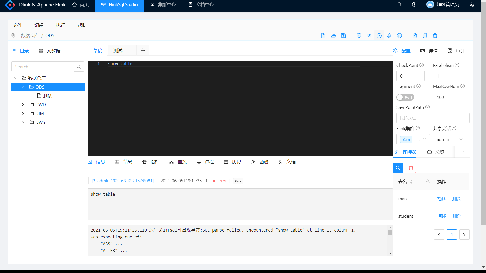 连接器为 Catalogue 里的表信息,清空按钮会销毁当前会话。